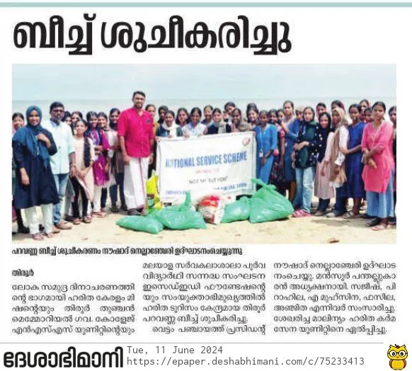 In connection with the Central Governmentβs βSwachhata Hi Seva 2024β campaign, a beach cleanup drive was conducted at Tirur Paravanna Beach. The initiative aimed to raise awareness on environmental cleanliness and sustainable tourism practices.