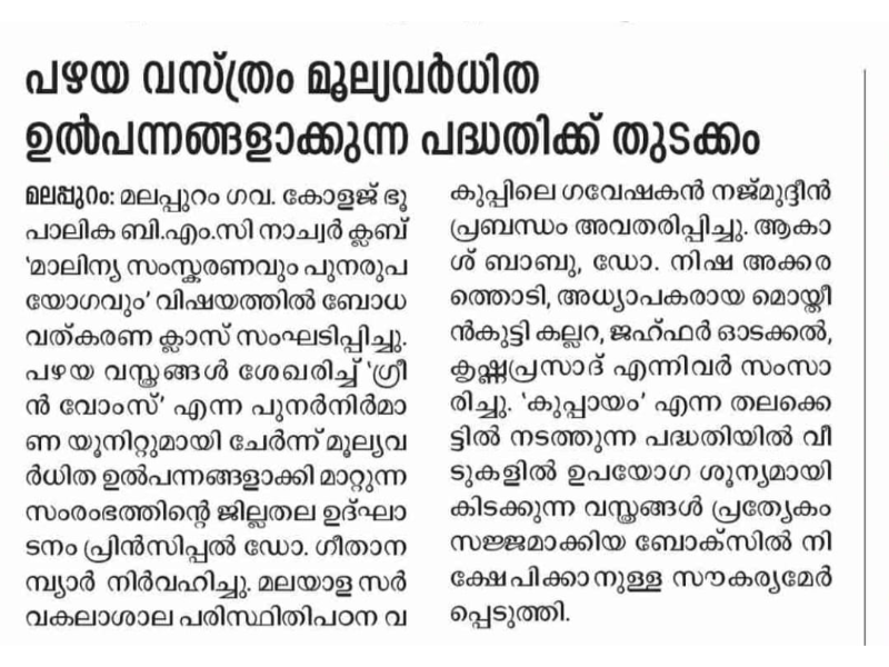 As part of the Campus for Nava Kerala initiative under the Haritha Keralam Mission, the School of Environmental Studies at Thunchath Ezhuthachan Malayalam University launched an Upcycling Lab focused on creative plastic reuse and eco-friendly alternatives. The lab aims to foster green skill development and promote student-led innovations in sustainability.
